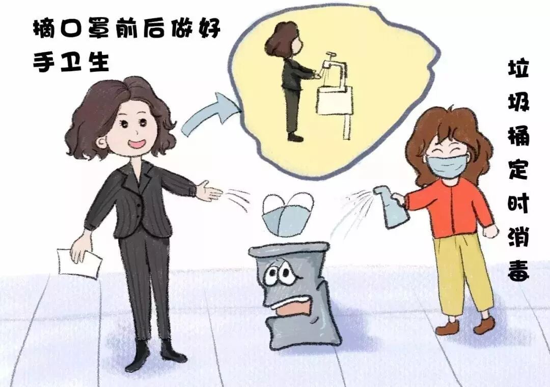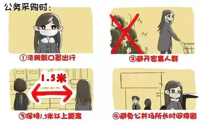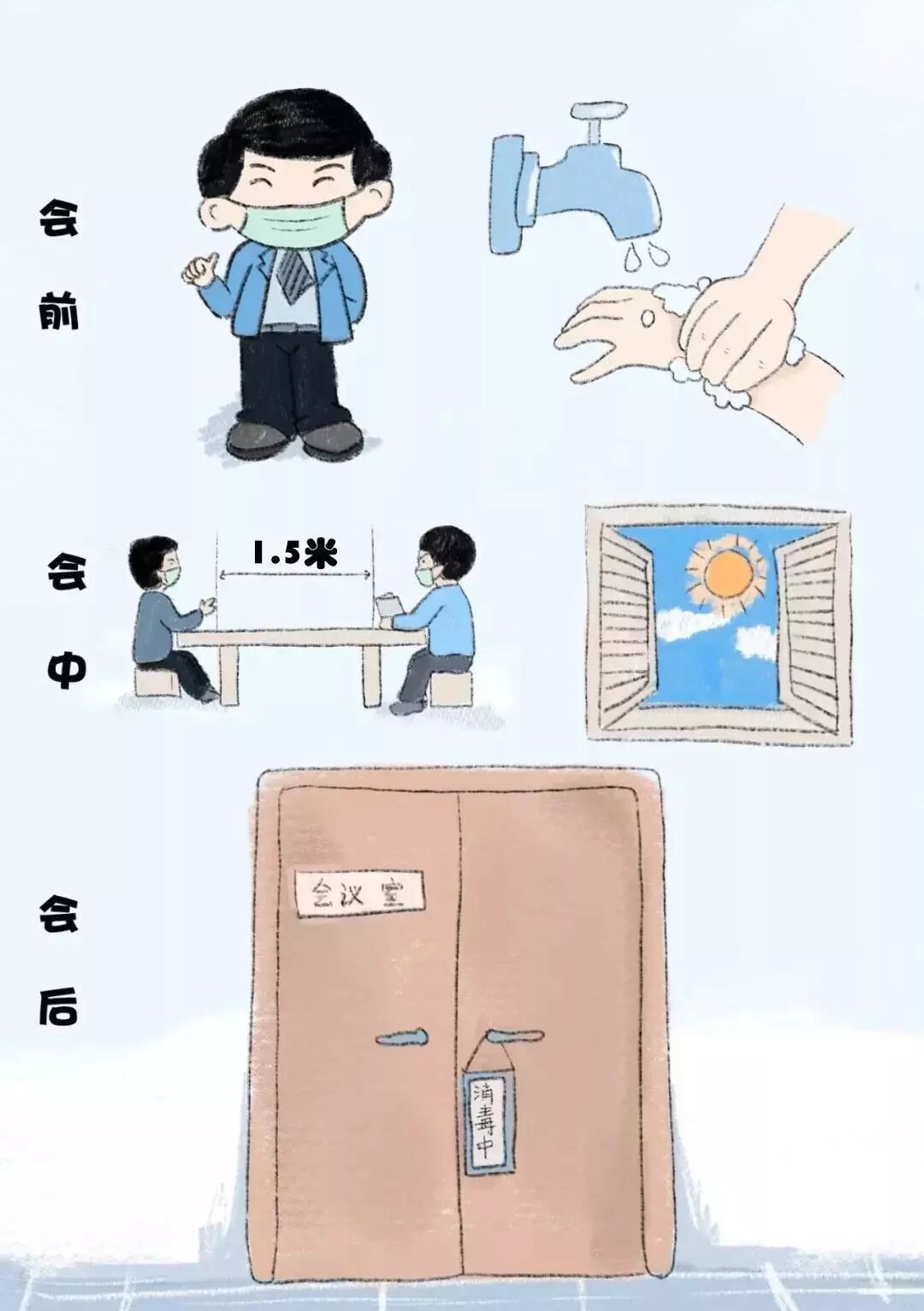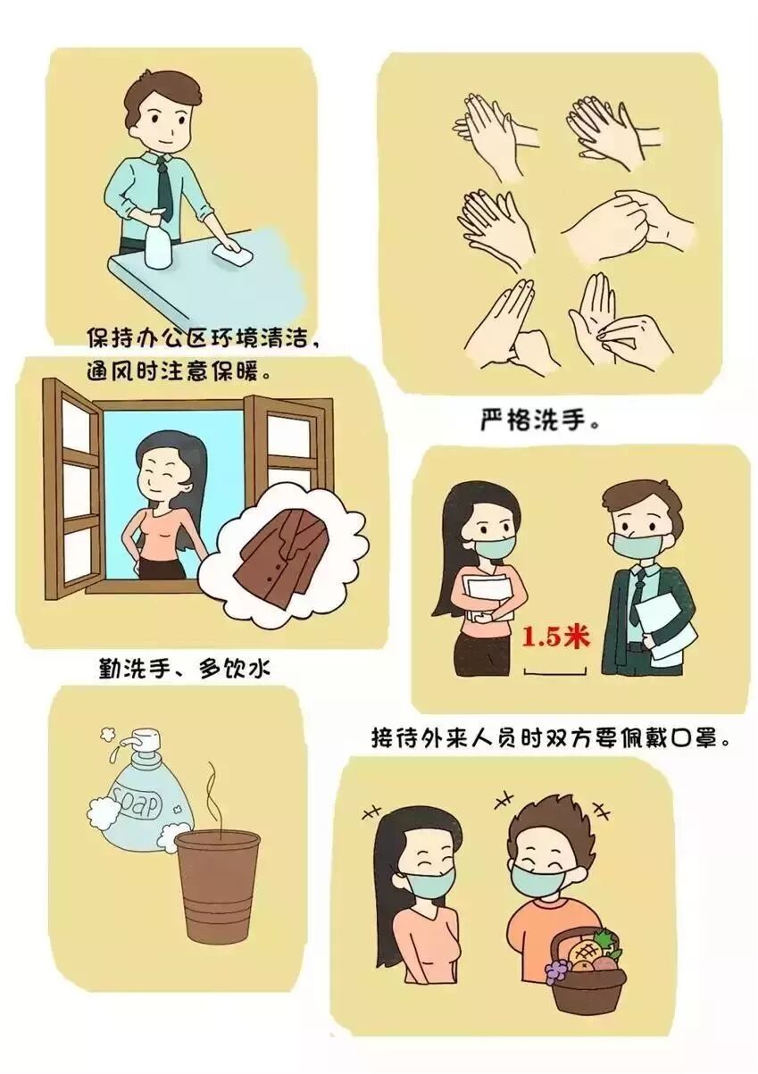 马上要开工了! 预防新型冠状病毒肺炎, 工作场所如何保护自己, 2020开工攻略漫画版来了! 正确佩戴医用口罩。尽量不乘坐公共交通工具,建议步行、骑行或乘坐私家车、班车上下班。如必须乘坐公共交通工具时,务必全程佩戴口罩。途中尽量避免用手触摸车上物品。 进入办公楼前自觉接受体温检测,体温正常可入楼工作,并到卫生间洗手。发热者,请勿入楼工作,并回家观察休息,必要时到医院就诊。 乘坐电梯要戴口罩。建议低楼层就爬爬楼吧! 保持办公区环境清洁,建议每日通风3次,每次20-30分钟,通风时注意保暖。不使用中央空调。 人与人之间保持1.5米以上距离,多人办公时佩戴口罩。保持勤洗手、多饮水,坚持在进食前、如厕后彻底洗手。接待外来人员双方佩戴口罩。 疫情期间建议不举办会议,可以采用远程协同视频会议。 必要的小型会议,建议佩戴口罩,进入会议室前洗手消毒。开会人员间隔1.5米以上。会议控制时间,时间过长时,开窗通风1次。 会议结束后场地、家具须进行消毒。茶具用品建议开水浸泡消毒,有条件的可用专用消毒柜消毒。 采用分餐进食,用餐减少交谈,建议错峰进餐或打包带回单独用餐。 餐厅每日消毒1次,餐桌椅使用后进行消毒。餐具用品须高温消毒。操作间保持清洁干燥,严禁生食和熟食用品混用,避免生食肉类。建议营养配餐,清淡适口。 须佩戴口罩出行,避开密集人群。与人接触保持1.5米以上距离,避免在公共场所长时间停留。 专车内部及门把手建议每日使用前后75%酒精擦拭1次。乘坐班车须佩戴口罩,建议班车在使用后用75%酒精对车内及门把手擦拭消毒。 须佩戴口罩。进入办公楼前首先进行体温检测,并介绍有无湖北居住史或接触当地人员情况,以及有无发热、咳嗽、呼吸不畅等症状。无上述情况,且体温正常条件下,方可入楼公干。 传递纸质文件前后均需洗手,传阅文件时佩戴口罩。 建议座机电话每日75%酒精擦拭两次,如果使用频繁可增加至四次。 每日须对门厅、楼道、会议室、电梯、楼梯、卫生间等公共区域进行消毒,尽量使用喷雾消毒。每个区域使用的保洁用具要分开,避免混用。 服务人员、安保人员、清洁人员工作时须佩戴口罩,并与人保持安全距离。 食堂采购人员或供货人员须佩戴口罩和一次性橡胶手套,避免直接手触肉禽类生鲜材料,摘手套后及时洗手消毒。 保洁人员工作时须佩戴一次性橡胶手套,工作结束后洗手消毒。 安保人员须佩戴口罩工作,并认真询问和登记外来人员状况,发现异常情况及时报告。 建议适当、适度活动,保证身体状况良好。避免过度、过量运动,造成身体免疫功能下降。 普通民众的废弃口罩不能投放在街面或单位垃圾桶,要带回社区丢至废弃口罩专用垃圾桶中。 洗手后佩戴一次性医用外科口罩外出,回到家中摘掉口罩后首先洗手消毒。手机和钥匙使用消毒湿巾或75%酒精擦拭。居室保持通风和卫生清洁,避免多人聚会。