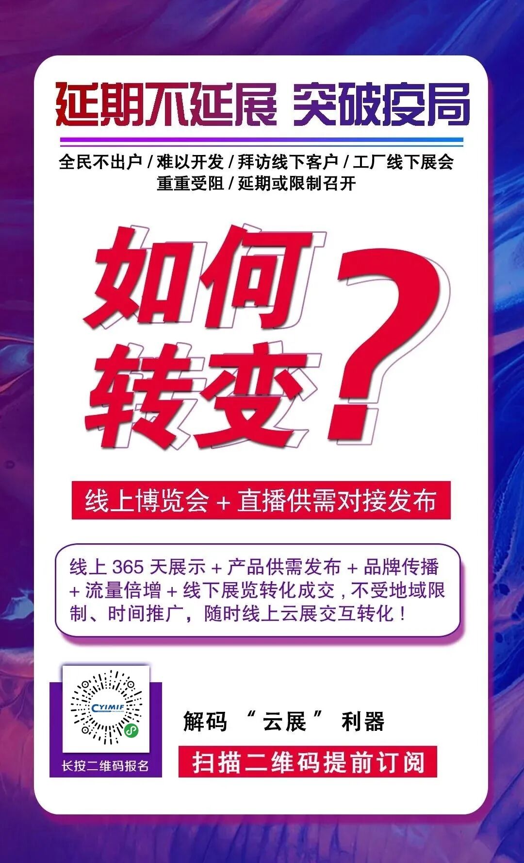 各项准备工作有序进行 维护广大参展商和参观商的利益 继续为大家提供优质服务 云展平台正式上线啦! 为展商提供疫情之下的宣传神器 为专业买家增加采购渠道 共克时艰,迎接机遇 受疫情影响,原定于3月29-4月1日在义乌国际博览中心举办的2020浙江印刷包装工业技术展览会延期至8月17-19日举办。随着疫情防控形势持续向好,生产生活秩序加快恢复,2020浙江印刷包装工业展的各项筹备工作也正按计划有序进行。为助力广大参展商和采购商,能在疫情及展会延期期间,实现商贸交流和邀约互动,保障企业参会效果,浙江印刷包装工业展组委会特别开通的线上云展平台正式上线啦。 浙江印刷包装工业技术展云展平台的推出将帮助企业实现线上供需对接,线下线上双管服务。除了是展商在疫情期间的宣传利器,也是各位观众足不出户就能满足采购需求,了解市场动向的好帮手。 功能亮点1依托线下,海量展示 2020浙江印刷包装工业展规划面积3万平方米,涵盖印刷机械、包装机械、标签印刷设备、标签设备、瓦楞设备、配件及耗材全产业链的500余家参展商和数万款名优产品。通过浙江印刷包装工业展云平台,组委会将为参展商和专业观众搭建出规模庞大、信息丰富、操作便捷的“线上展馆”,即展前进行线上展示与选品、预热与互动,展中进行线下线上联动,实现线下线上功能叠加,使厂商参会效果最大化。 功能亮点2 智能匹配,精准交易 通过大数据和智能算法,2020浙江印刷包装工业展将海量的专业采购商及参展商需求进行精准匹配,帮助参展商精准触达目标客户,帮助采购商优选厂家货源,并提供双方在线选品、在线沟通、展前邀约及展期邀约日程提醒功能,让参展双方的交易效率成倍提高,行业人士通过浙江印刷包装工业展云展平台,能够充分了解参展的品牌、产品和展会服务,并通过线上博览会平台小程序实现算法推荐和自主选择两种方式的厂商贸易配对,实现精准的贸易对接。 功能亮点3智慧服务,舒心逛展 通过大数据和智能算法,2020浙江印刷包装工业展将海量的专业采购商及参展商需求进行精准匹配,帮助参展商精准触达目标客户,帮助采购商优选厂家货源,并提供双方在线选品、在线沟通、展前邀约及展期邀约日程提醒功能,让参展双方的交易效率成倍提高,行业人士通过浙江印刷包装工业展云展平台,能够充分了解参展的品牌、产品和展会服务,并通过线上博览会平台小程序实现算法推荐和自主选择两种方式的厂商贸易配对,实现精准的贸易对接。 通过大数据和智能算法,2020浙江印刷包装工业展将海量的专业采购商及参展商需求进行精准匹配,帮助参展商精准触达目标客户,帮助采购商优选厂家货源,并提供双方在线选品、在线沟通、展前邀约及展期邀约日程提醒功能,让参展双方的交易效率成倍提高,行业人士通过浙江印刷包装工业展云展平台,能够充分了解参展的品牌、产品和展会服务,并通过线上博览会平台小程序实现算法推荐和自主选择两种方式的厂商贸易配对,实现精准的贸易对接。 2020浙江印刷包装工业展览会云端平台,为参展参会客商提供参展窗口,采购商登记、交通指南、展馆预览、酒店餐饮预订、电子会刊、论坛活动日程等多项线上服务功能,致力于为客商提供更加人性化及舒适便捷的参会体验,将成为广大客商参展参会的好助手,尽在“掌”握的贴心小管家,倾力打造以参会者为核心的沉浸式体验。本次浙江印刷包装工业展云展平台的推出,将打通印刷包装行业供应链线上线下全渠道、变革展会的展览形态。作为印刷包装行业首选的线上展会服务及交易配对平台,印刷包装行业云端平台不仅入驻商家权威、产品信息全面,而且在现阶段,无论是对参展商还是专业观众,所有服务全部免费。为保障2020浙江印刷包装工业展