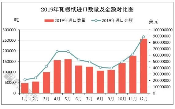 2019年中国的瓦楞纸进口量大致呈现先增后降再大增的走势。