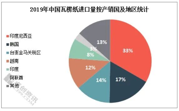 2019年中国瓦楞纸进口量主要来自于印度尼西亚、韩国、台澎金马关税区、越南、印度及阿联酋等地区,进口量分别为52.36万吨、26.73万吨、21.50万吨、19.24万吨、12.18万吨、4.30万吨以及其他地区约21.11万吨。