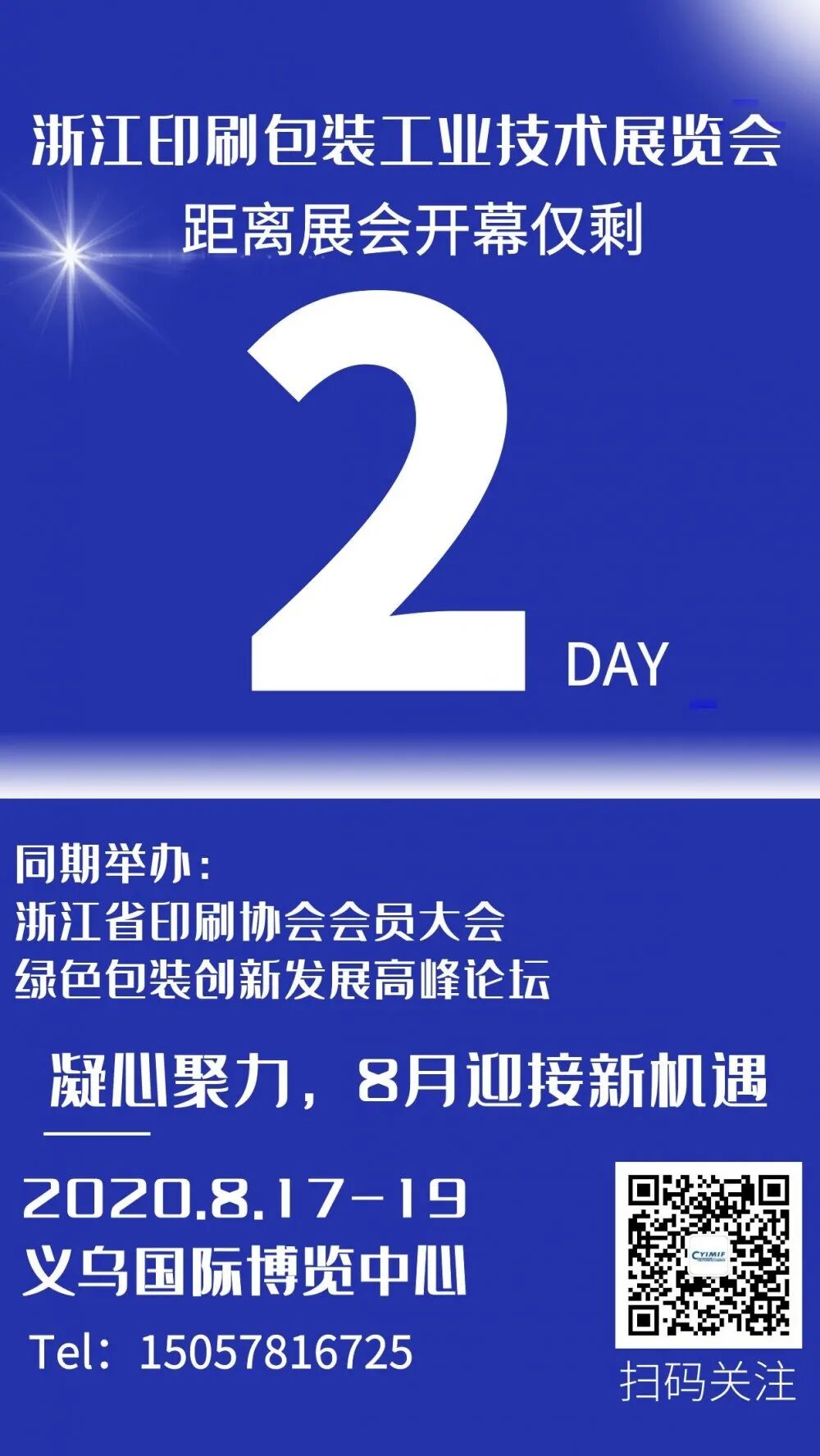 参会服务安全完善 为保障参会安全,组委会进行了专业充分的防疫演练,设置了严格的入场流程,准备了齐全的防疫物资,各位观众您还有什么不放心来参观的呢?~ 参观时间 ↓↓↓↓ 8月17日 星期一 09:00 - 17:00 8月18日 星期二 09:00 - 17:00 8月19日 星期三 09:00 - 14:00 参观准备 ↓↓↓↓ ✔本人身份证 ✔健康码/防疫信息码(显示绿码) ✔展会参观码 ✔口罩 入场流程 ↓↓↓↓ 长按下方二维码, 直接进入预登记页面 馆外准备工作 ↓↓↓↓ 馆内搭建稳步有序 除了防疫演练,展馆内各展台和活动功能区的搭建也在热火朝天进行中。 组委会随时在线 如果您在展会期间有任何不明白或者需要帮助的地方,请寻找身穿黄色polo衫的组委会工作人员,他们将尽可能为您解决一切麻烦。 倒计时最后2天 后天上午9:00 义乌国际博览中心 阔别多月的等待 我们不见不散 联系我们 浙江印刷包装工业技术展览会 时间:2020年8月17-19日 地点:浙江-义乌国际博览中心 潘俊超 手机:15857973997微信同号) 传真:0579-85130770 邮箱:591239882@qq.com 官网:http://ys.ywbz-expo.com 长按关注“义乌印刷工业展”微信公众号 与数万印包人同行